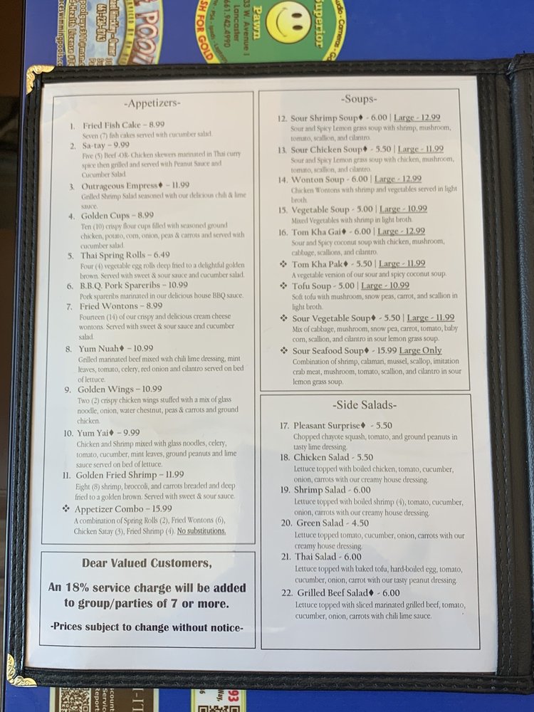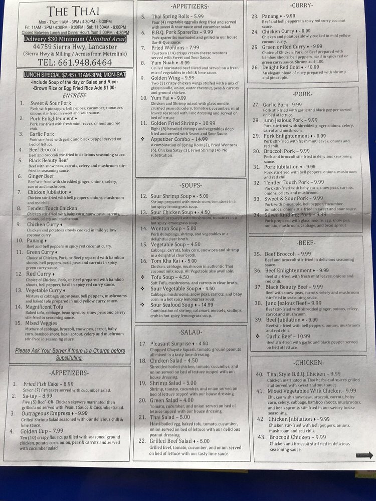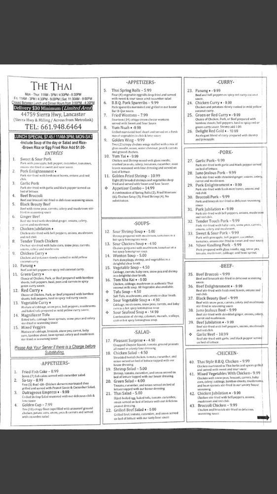 Welcome to The Thai Restaurant, where culinary excellence meets vibrant Thai tradition! Nestled in Lancaster, CA, this delightful establishment specializes in authentic Thai noodles and fresh seafood. The menu boasts an array of delectable dishes, from Garlic Pork to spicy Pork Enlightenment, catering to diverse palates and dietary preferences, including vegetarian and vegan options.